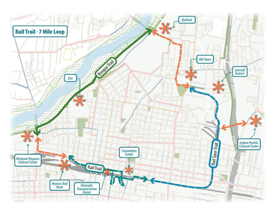 The 7-mile Rail Trail Loop will connect key destinations in the greater downtown area like the National Hispanic Cultural Center, BioPark, Old Town, Sawmill District, Indian Pueblo Cultural Center, Convention Center, Rail Yards, and more.