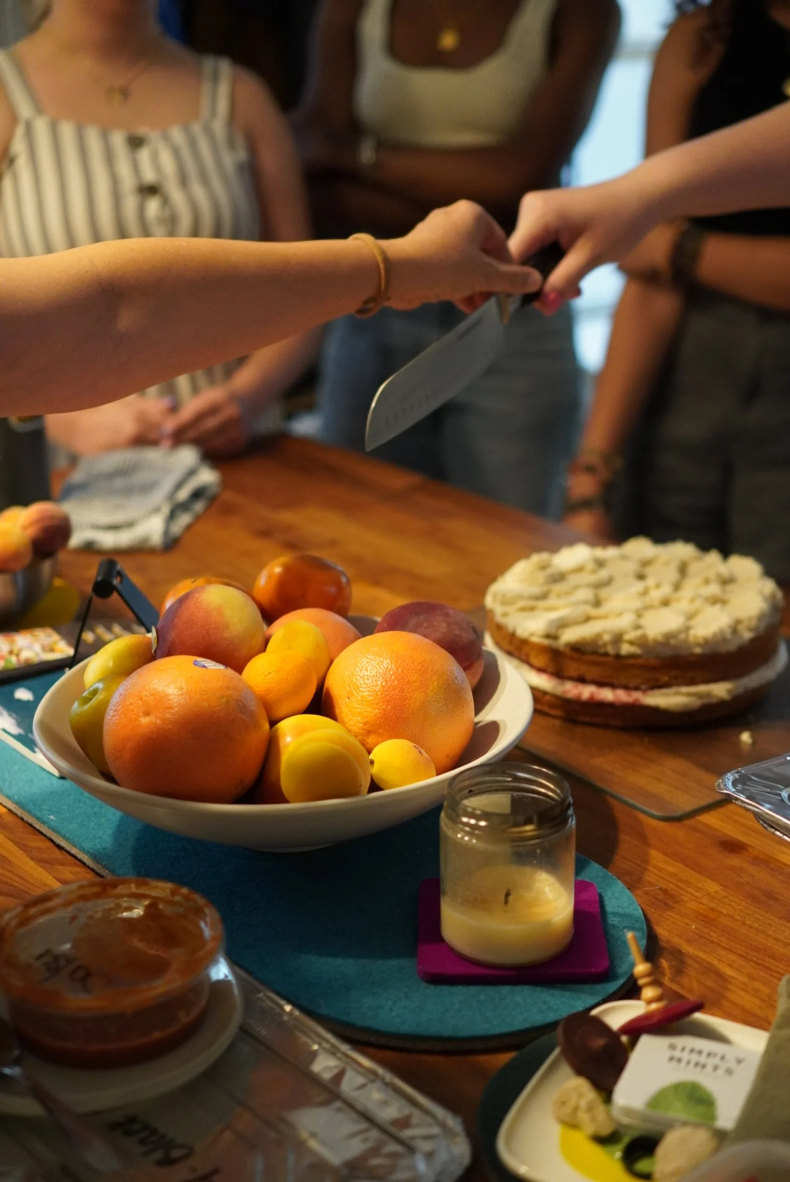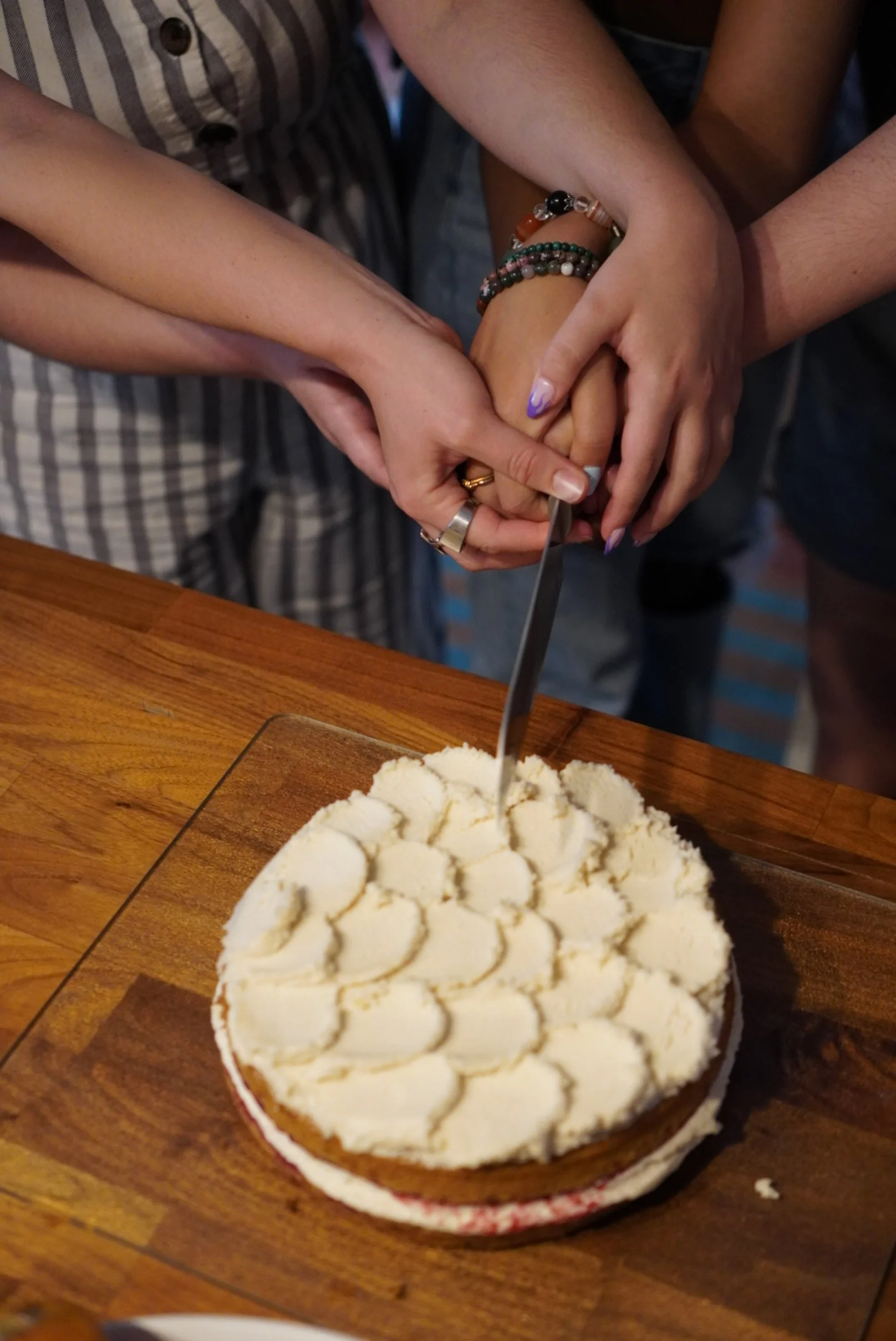 Cutting the cake at the opening dinner for The Manoa Project 2023, featuring the beautiful hands of Andy Gustke, Jennifer Eison, Lauren Taylor, Jayla Sullivan-Franklin, and Madrone Matysiak.