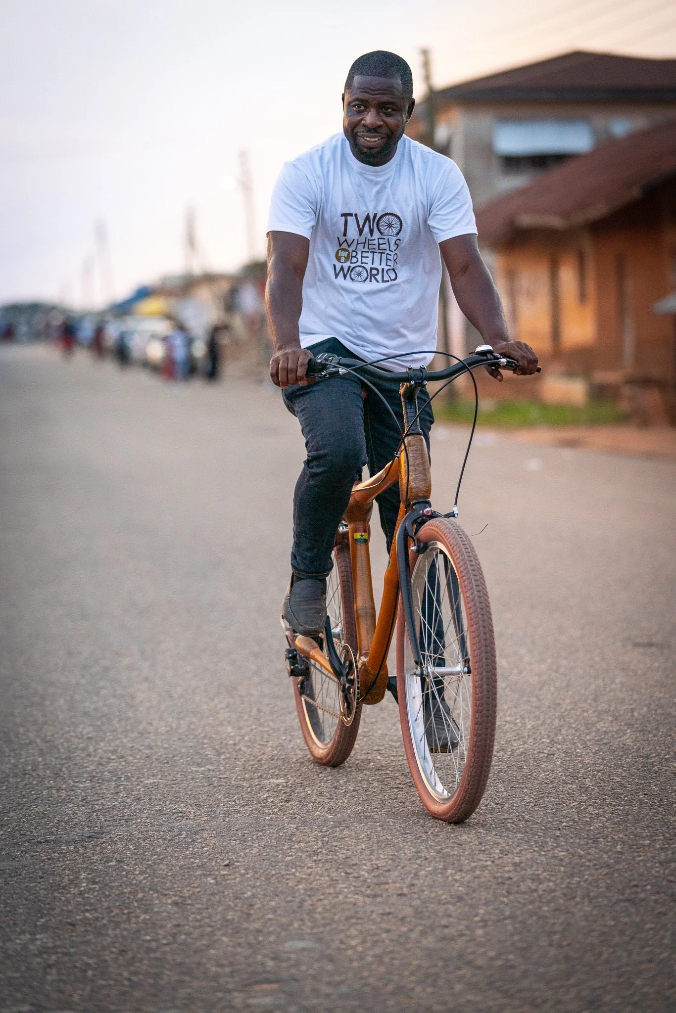 Kwabena Danso. Economic stability, education and resources are all points of contention for the people of rural Ghana. But one man changing things is Kwabena Danso. Growing up in Yonso, Ghana, with only an exercise book and a single pen, Kwabena’s story of rags to riches is one you may be familiar with. The resounding difference? Kwabena’s mentality is that wealth shouldn’t be used for greed and accumulation, and instead should be distributed more evenly to provide opportunities for the next generation. Now the owner of a bamboo bike enterprise, Booomers Bikes, he has since produced over 3,000 frames, employed over 50 young people aged between 18 and 29, and provided an income to 20 young people who harvest and 200 farmers who cultivate bamboo. Kwabena also uses a percentage of the profits to build and maintain a school in his childhood village as well as give bikes to children where distance is a barrier to education.