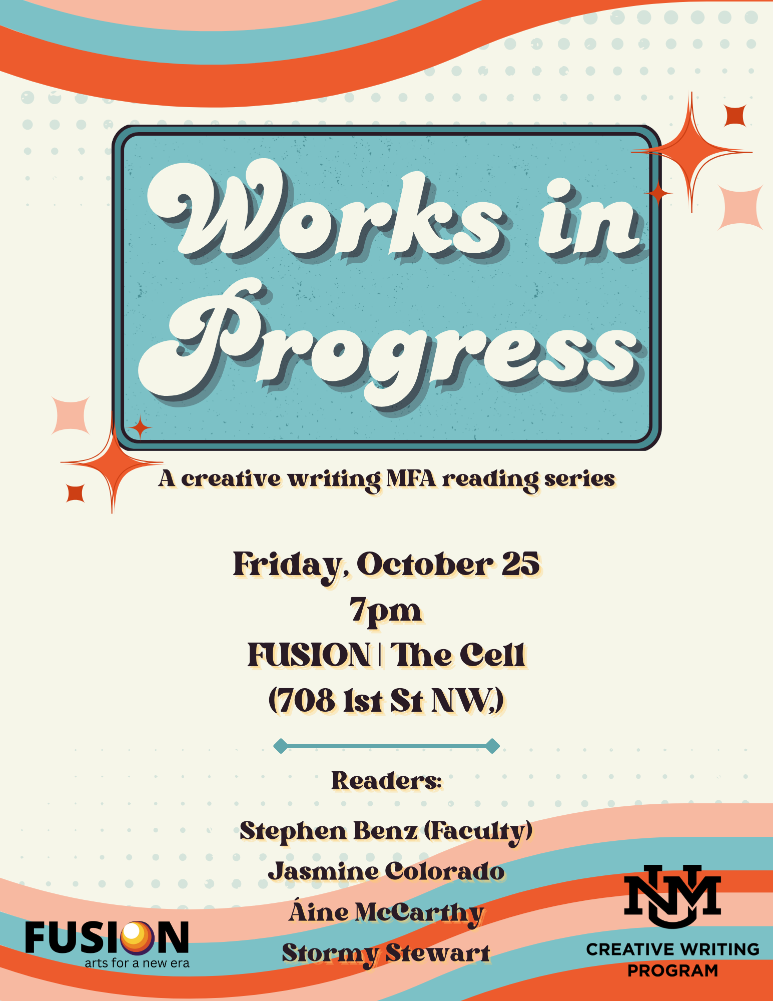 We are thrilled that the UNM Creative Writing Program’s MFA Reading Series, Works in Progress (WIP), will be at FUSION this fall! Join us for WIP at FUSION | The Cell on October 25th, at 7 PM!