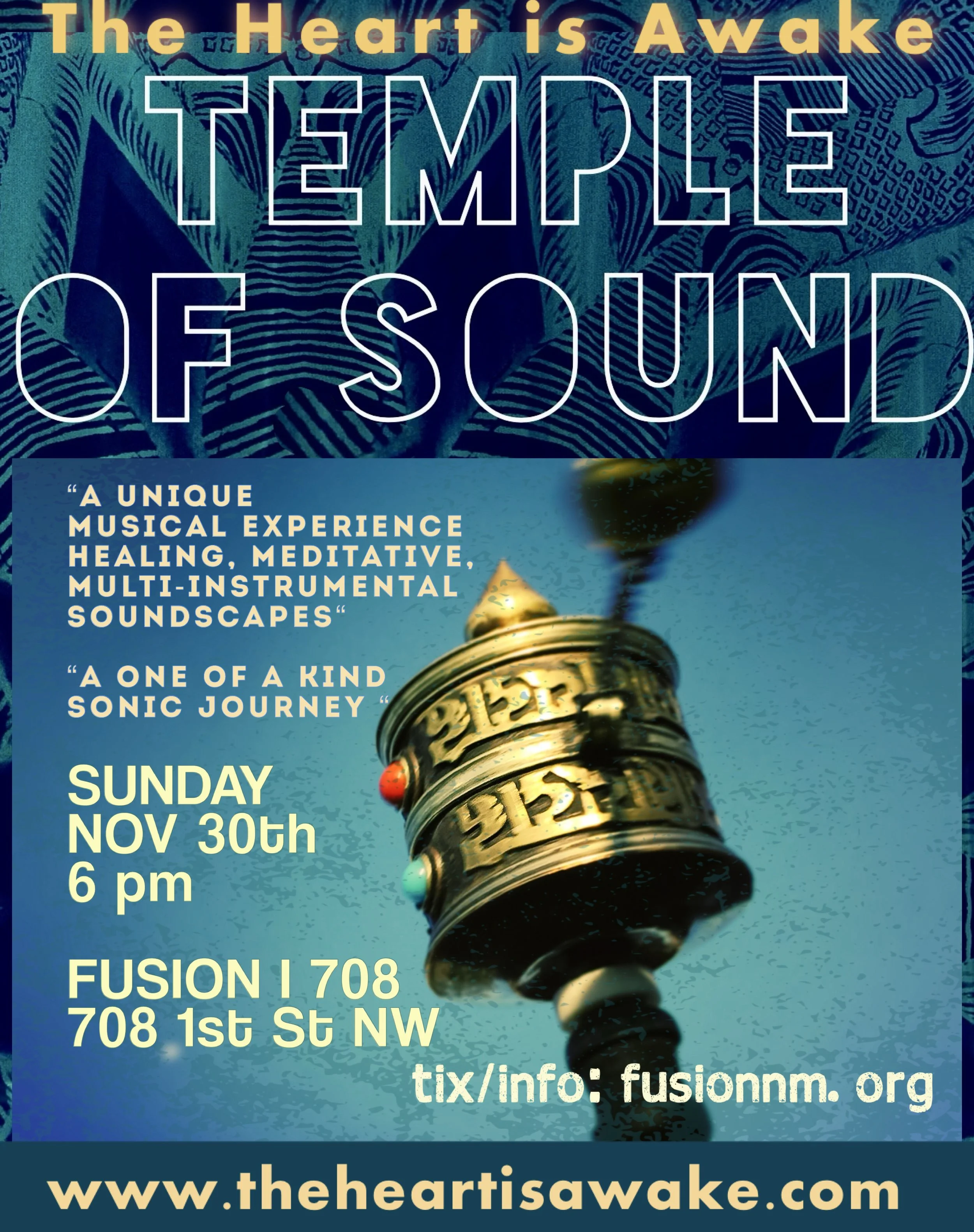 The HEART is AWAKE presents a new TEMPLE OF SOUND, bridging the worlds of experimental and psychedelic music with sacred sounds and vibrational journeys featuring special guest singers and a few surprises. You’re invited to experience a sound blessing from Shingetsu Billy White at FUSION | 708 on Sunday, November 30, at 6 PM.