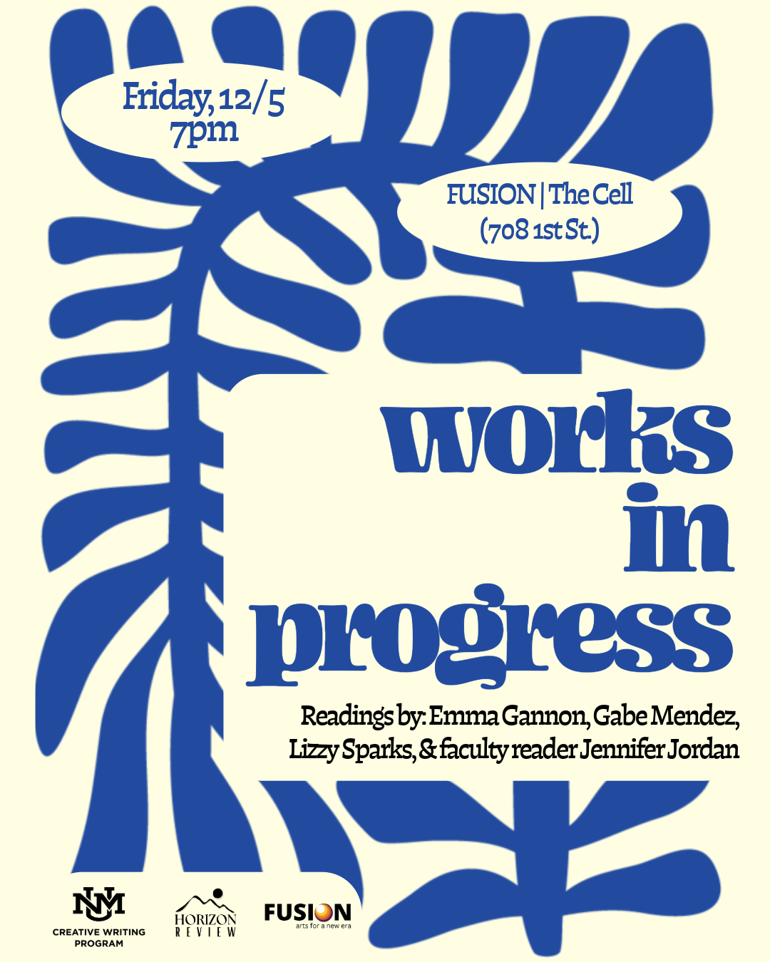 The UNM Creative Writing Program’s MFA Reading Series, Works in Progress (WIP), is back at FUSION! Join us for WIP at FUSION | The Cell on December 5, at 7 PM!
