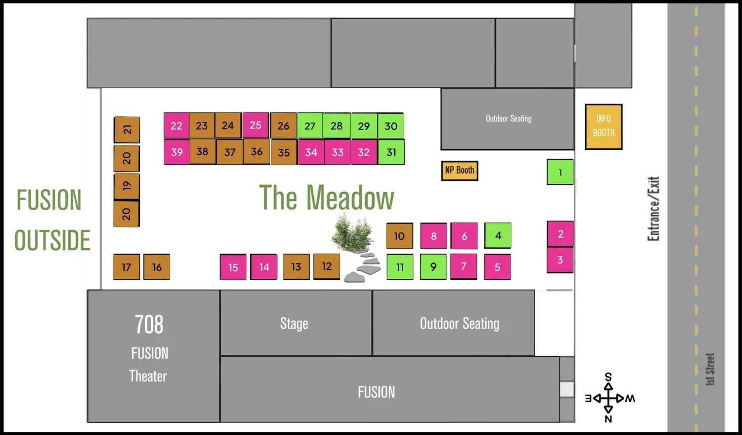 There are 3 maps/locations: The Meadow (outside), the FUSION | 708 Lobby, and the FUSION | 708 Event Space—be sure to click on each location to be sure you see all vendors scheduled.