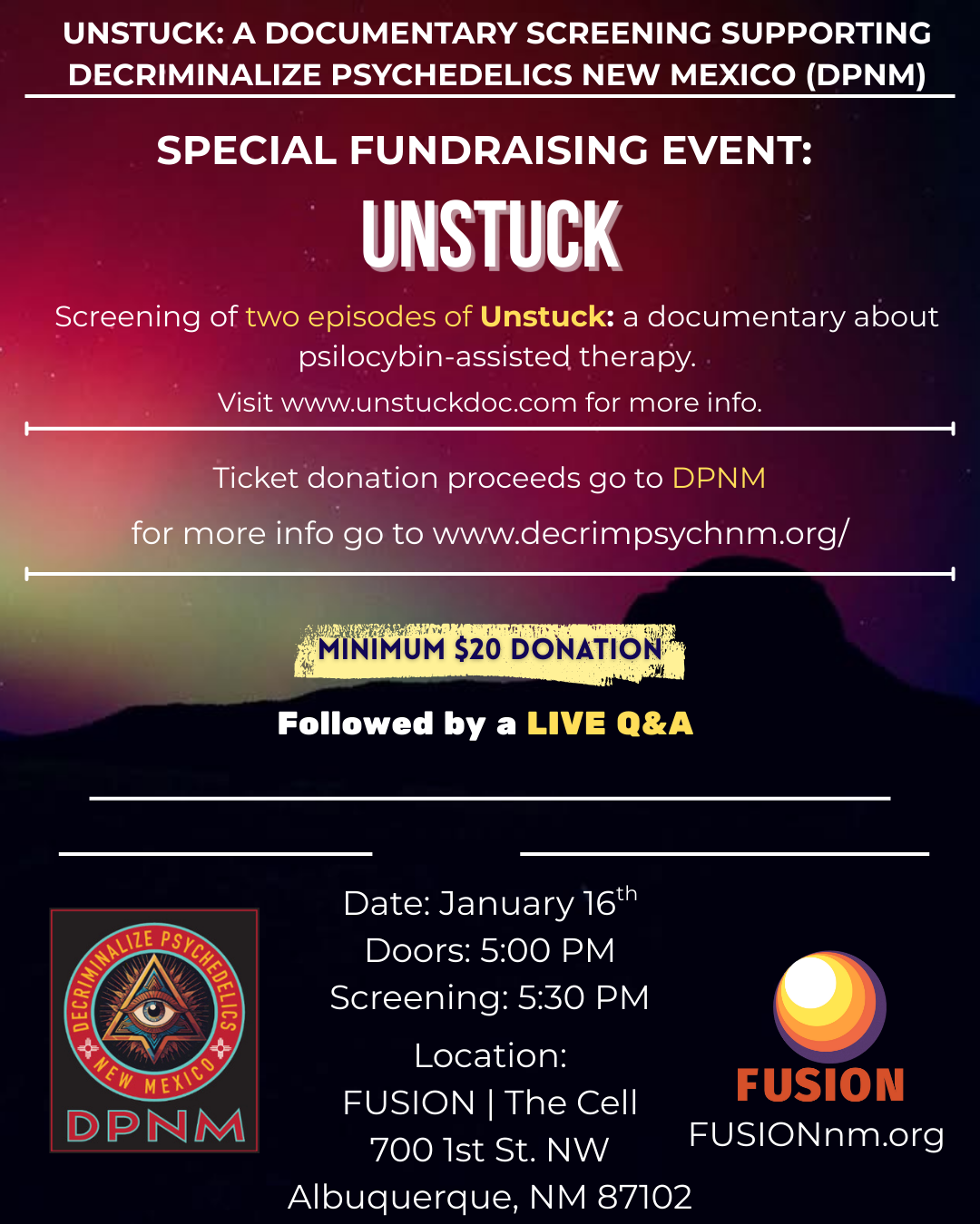 Join Decriminalize Psychedelics New Mexico (DPNM) at FUSION | The Cell on Friday, January 16, at 5 PM, for a special screening of Unstuck, a documentary series exploring the transformative potential of psychedelic-assisted therapy and the people helping bring this work into the light.