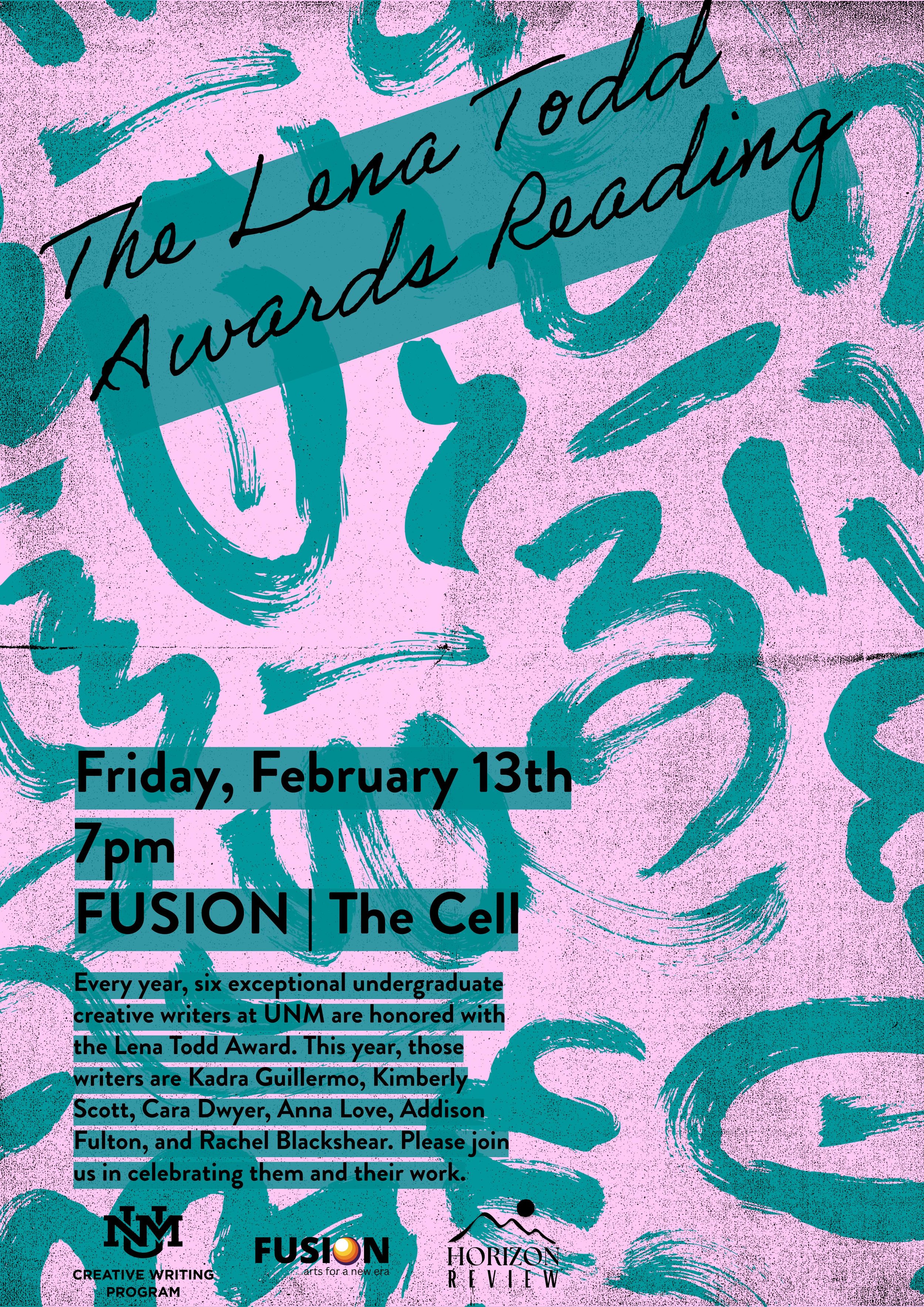 The UNM Creative Writing Program: Lena Todd Awards Annual Reading is being held at FUSION! Join us at FUSION | The Cell on Friday, February 13, at 7 PM!