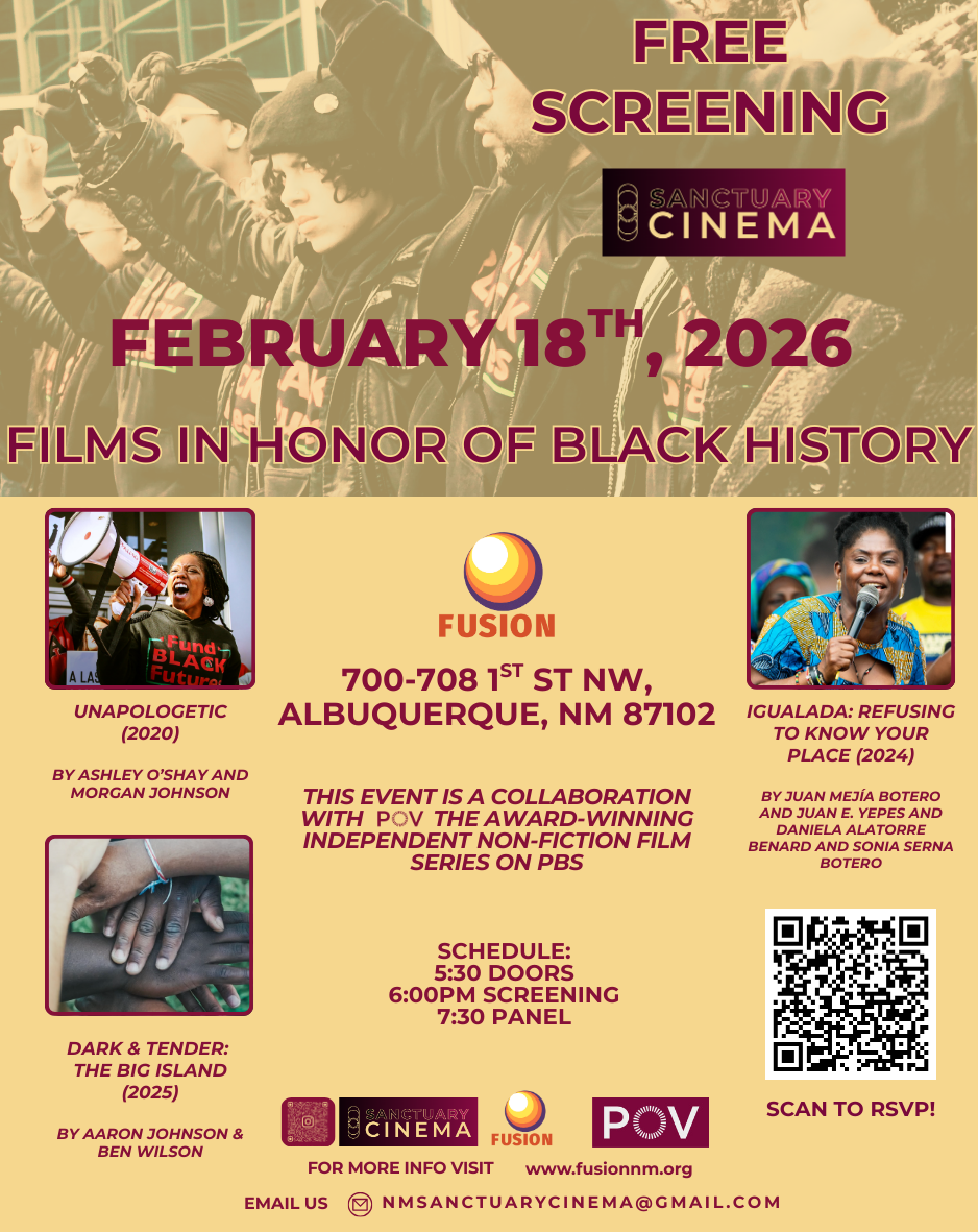 Sanctuary Cinema brings nonfiction films to New Mexicans for free through the PBS/POV program by hosting monthly screenings and panel discussions with local nonprofit and New Mexico artists and activists at venues throughout the city of Albuquerque. Sanctuary Cinema, is a brave space for transformative justice and belonging through film. Using the power of storytelling in film to build communities committed to action on contemporary social issues, they aim to educate, inspire, and act! Email them for more information : nmsanctuarycinema@gmail.com.