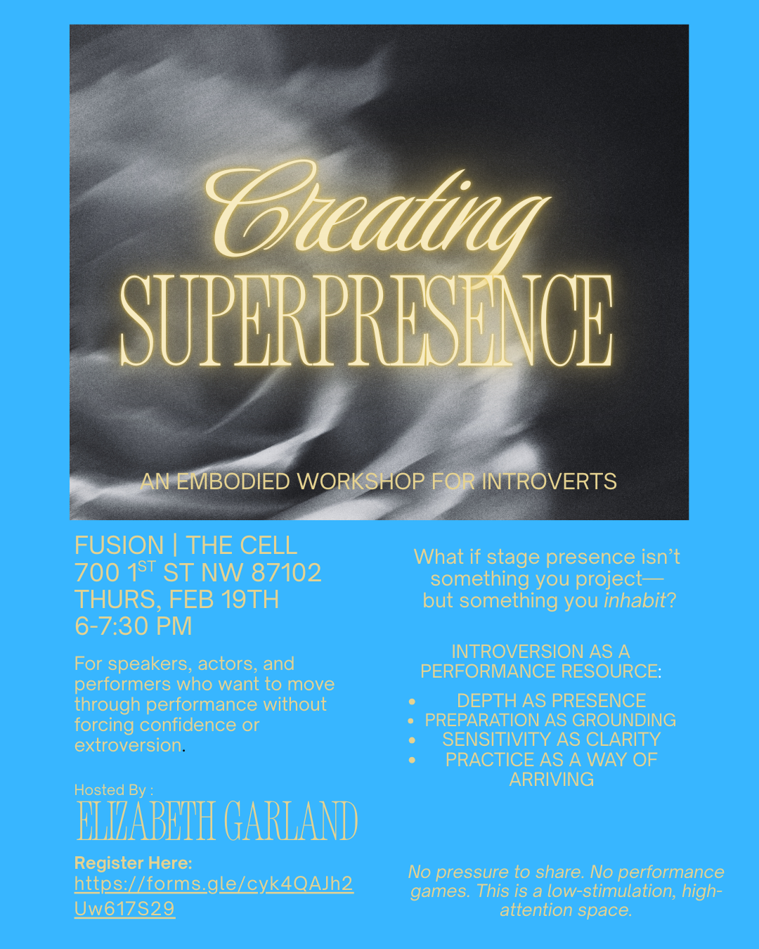 Led by Elizabeth Garland, composer, performer, and creator of Superpresence, the workshop draws on years of performance, teaching, and research to offer a grounded, compassionate approach to being seen. Thursday, Feb 19, 6–7:30 PM at FUSION | The Cell. Registration is limited to 20 participants.