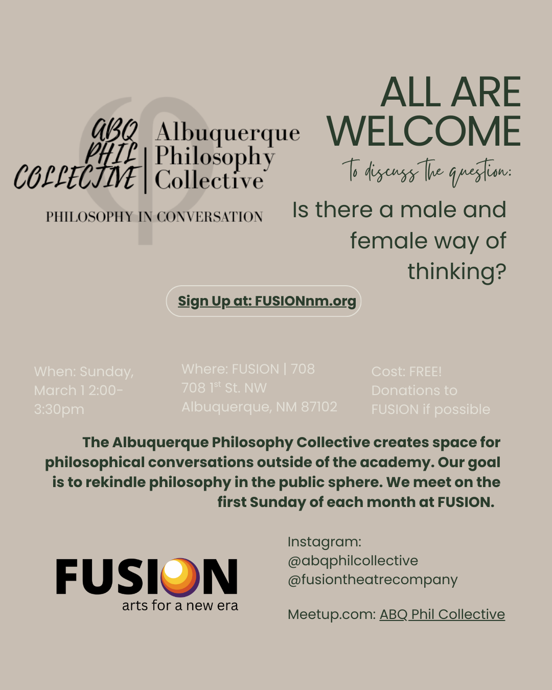 The Albuquerque Philosophy Collective hosts their monthly meetings on the FUSION campus. This meeting is scheduled for Sunday, March 1, from 2–3:30 PM at FUSION | 708. All are welcome to come discuss the question, “Is there a male and female way of thinking?”