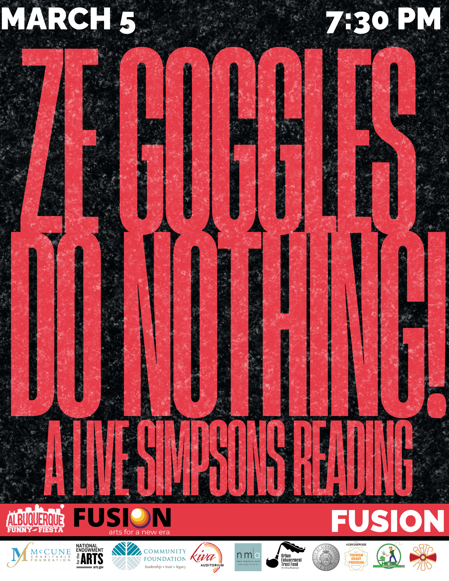 Albuquerque Funny Fiesta is bringing two of this year’s events to FUSION | 708! The first event is Ze Goggles Do Nothing!: A Live Simpson’s Reading on Thursday, March 5, at 7:30 PM!