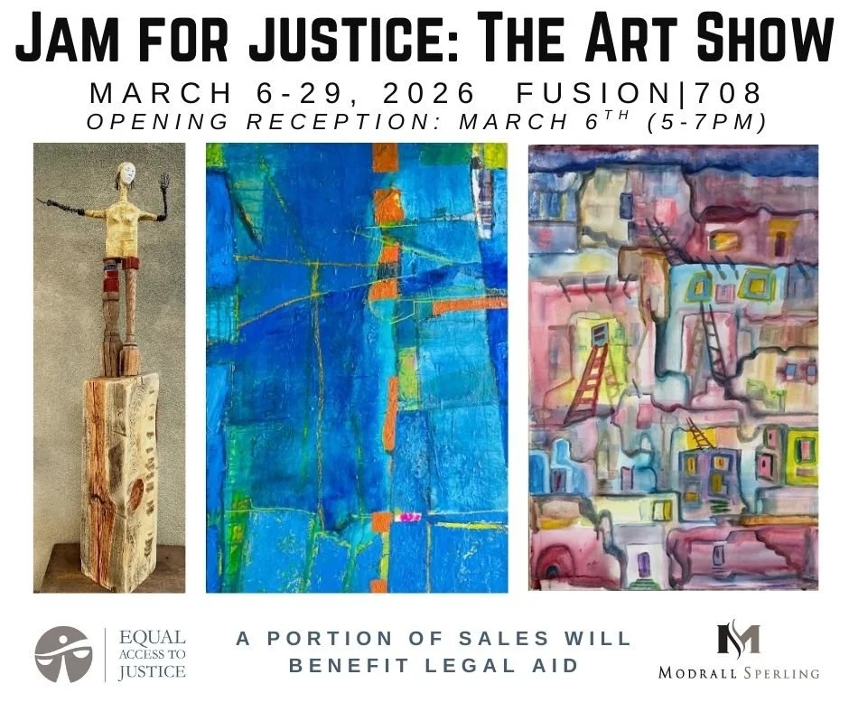 Equal Access to Justice invites you to the opening reception of JAM FOR JUSTICE: THE ART SHOW at FUSION | 708 on Friday, March 6, from 5–7 PM. This juried exhibition features over 25 artists who are, or were, involved in the legal profession (lawyers, paralegals, legal aid staff, law school students, social workers, mental health professionals, interpreters, “friends of justice” and more). In conjunction with Equal Access to Justice’s JAM FOR JUSTICE battle-of-the-bands on March 11, this month-long exhibit will showcase talents taken from the right side of the brain and help raise funds for New Mexicans in dire need of free civil legal services. Over 50 pieces of art, in a range of mediums, will be available for purchase, with 30% or more of each sale benefiting legal aid.