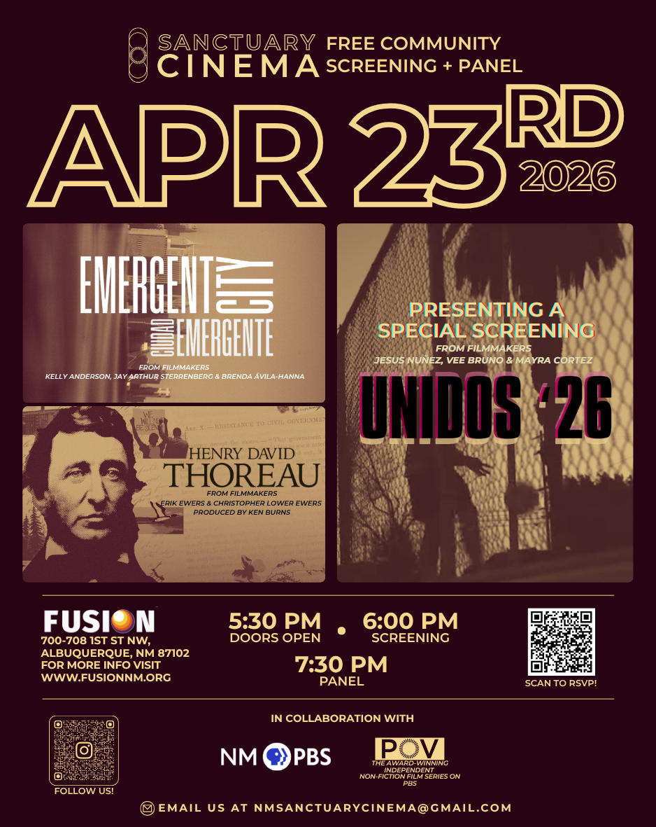 Join Sanctuary Cinema, in collaboration with PBS, POV PBS, and NMPBS, for a community screening of segments from two films streaming on the PBS App—Emergent City and Henry David Thoreau—plus a special screening of the short film UNIDOS '26.