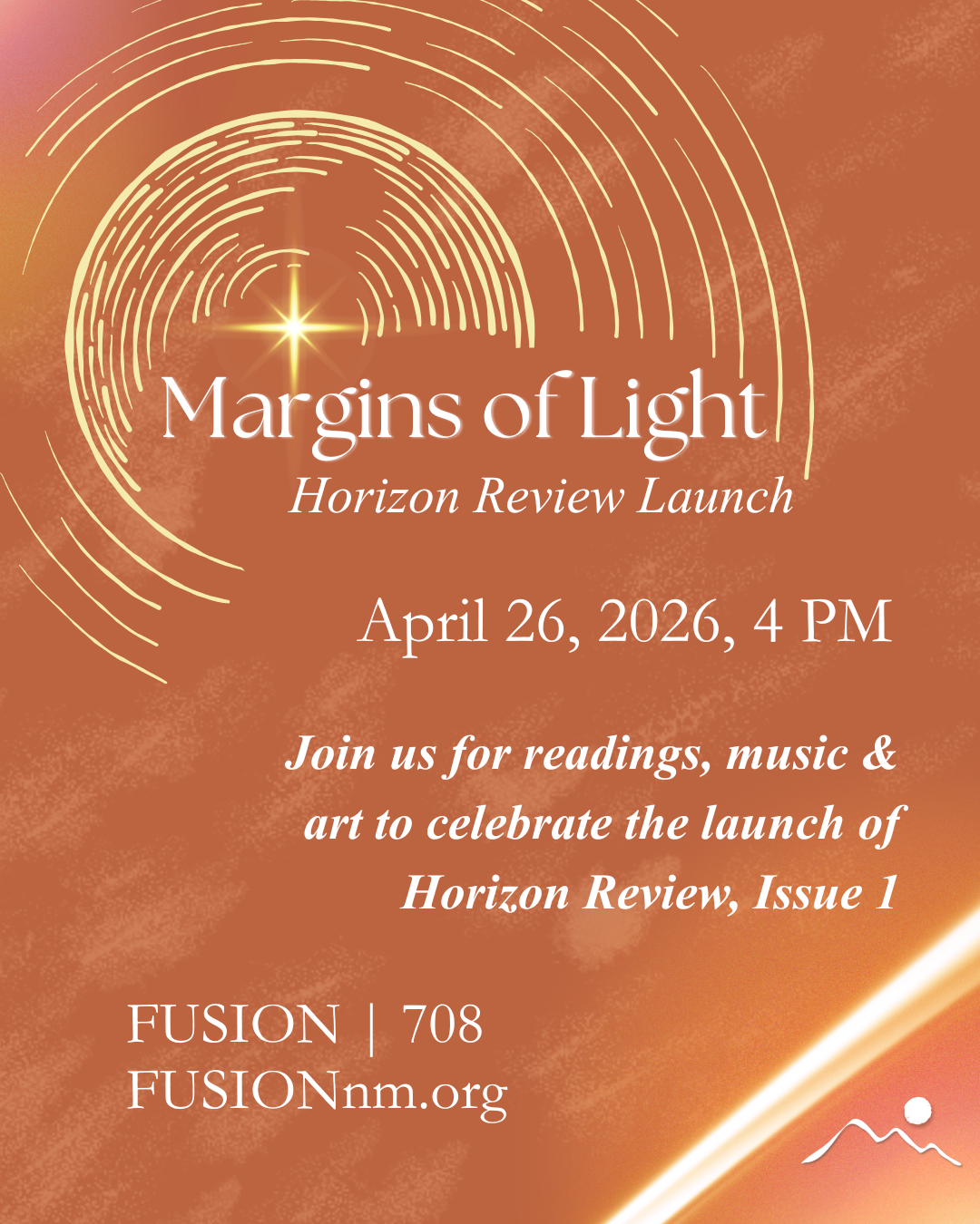 Horizon Review is an annually published magazine based in Albuquerque, NM under the umbrella of the non-profit organization, FUSION–a local professional theatre and cultural & arts hub. We publish literature, arts, and open media from writers and artists in the Southwest in both print and digital publications. We are proud to provide paid and credit-earning internships to University of New Mexico students and beginning professionals.